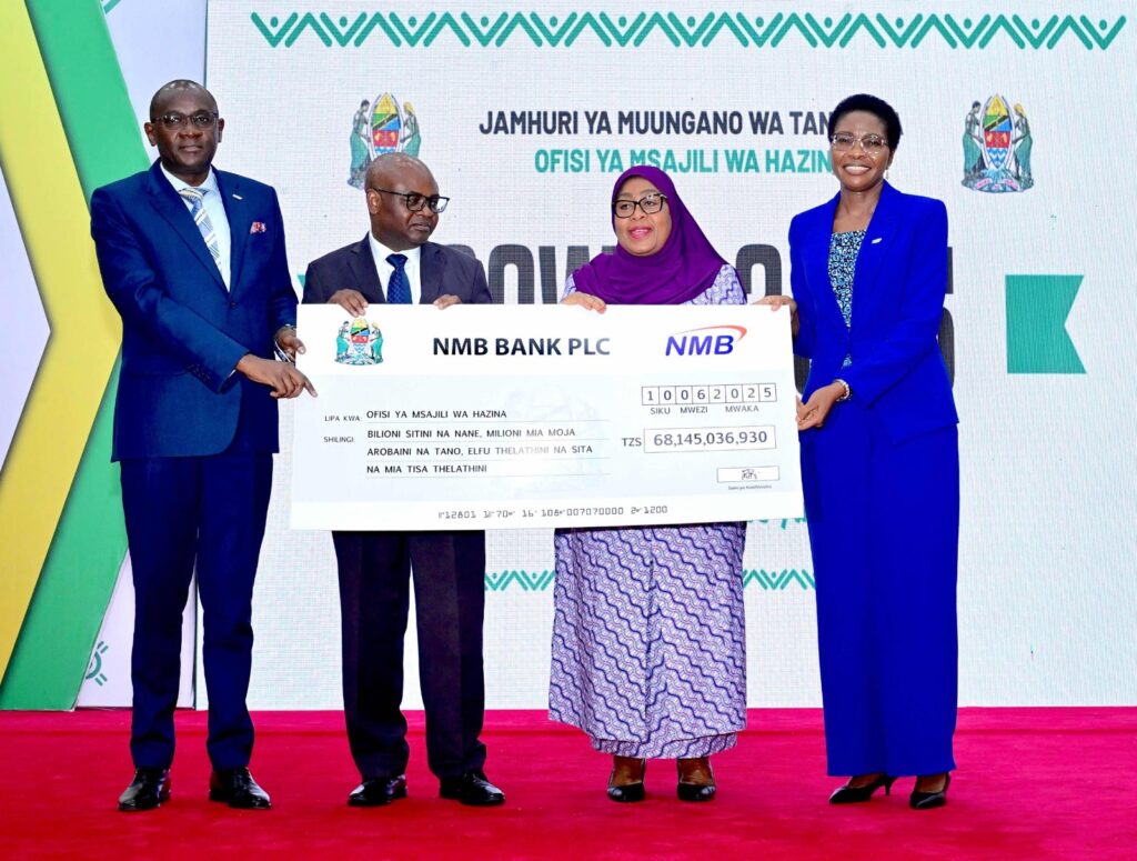 President Samia Suluhu Hassan being presented with a symbolic cheque of TSh68.145 billion by the Chairman of the Board of NMB Bank, CPA David Carol Nchimbi (left), and the Chief Executive Officer, Ms Ruth Zaipuna (right). Also pictured to the left of the President is the Minister of Planning and Investment, Prof. Kitila Mkumbo.