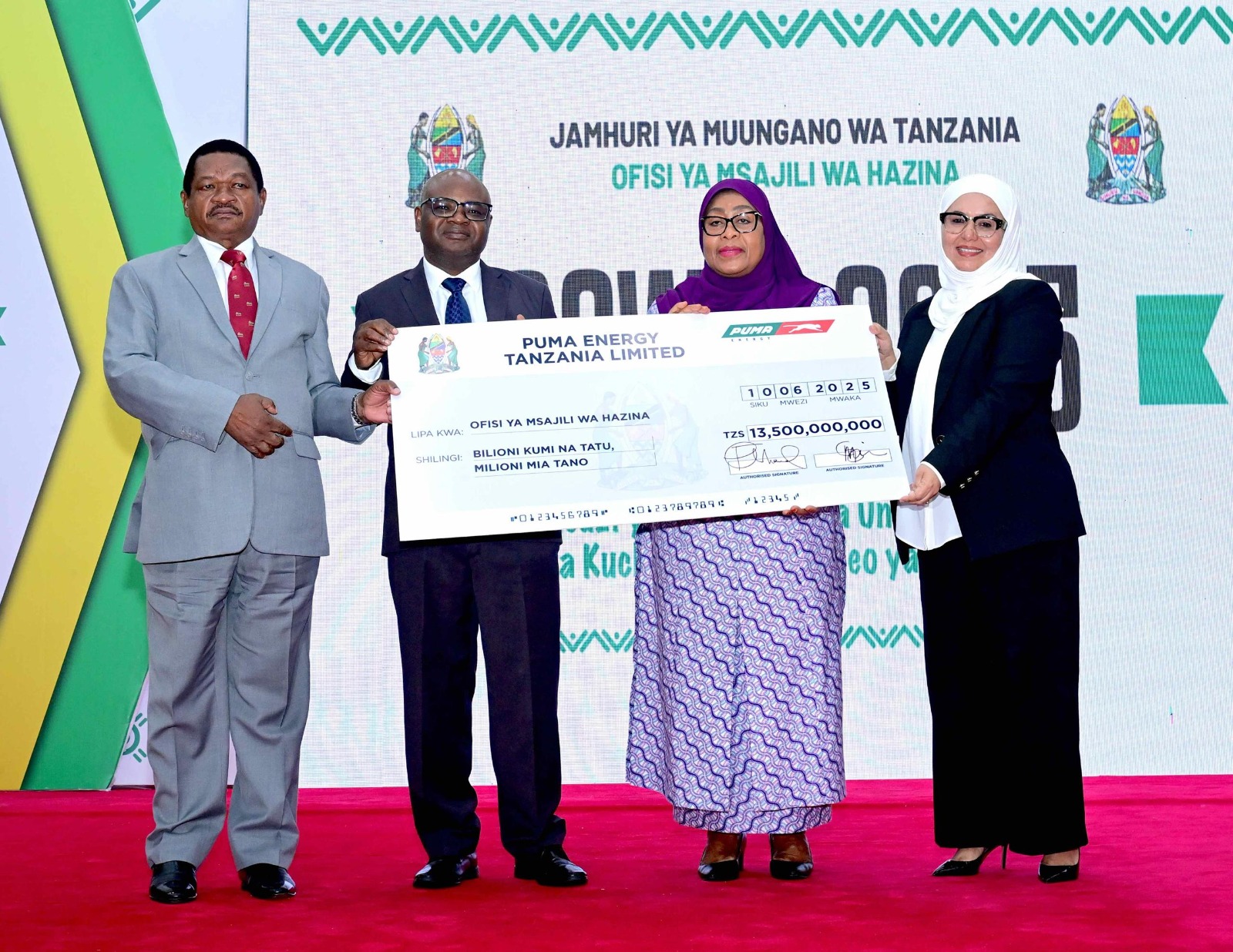 President Dr. Samia Suluhu Hassan, , being presented with a symbolic cheque of TSh13.5 billion by the Chairman of the Board of Puma Energy Tanzania, Ambassador George Madala (left), and the Managing Director, Ms Fatma Abdallah (right). Also pictured to the left of the President is the Minister of Planning and Investment, Prof. Kitila Mkumbo.