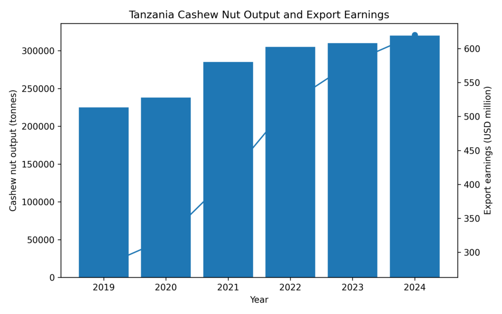 According to TRA and Bank of Tanzania projections, cashew exports are expected to earn about US$527.6 million in 2025, nearly double the previous year. In 2024, the crop earned US$225.6 million, up from US$206.4 million in 2023, when it ranked ninth among Tanzania’s top foreign exchange earners.